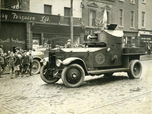 Lot.147. Rare press photo of Free State armoured car in Baggot Street during Civil War. Estimate €200-400
