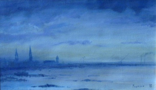 ‘Dun Laoghaire at Dusk’ Oil on canvas, 23cm high, 40cm wide by Peter Pearson. Est. €300 – €400