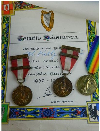 Two 1939-46 Emergency medals, & two certificate which name James Kelly & M Kelly & also a great war for civilisation medal 1914-1919 engraved Pte. M Kelly RIR Regt. Est.€300 – €400