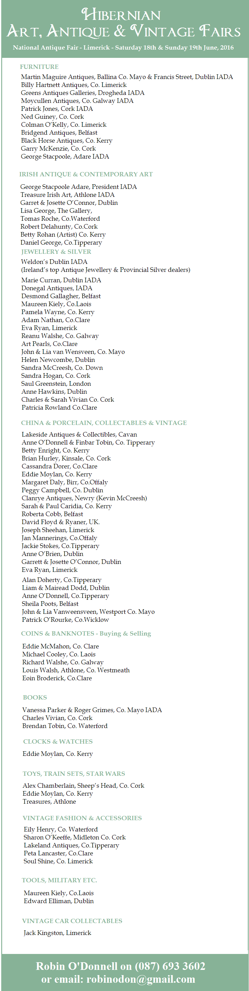 THE NATIONAL ANTIQUES, ART & VINTAGE FAIR – LIMERICK – Sat.19th & Sun.20th March, 2016